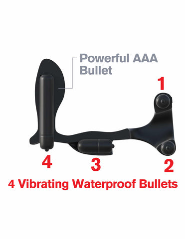 Made from our silky-smooth Elite Silicone, this quadruple-action cock ring doubles as a wearable P-Spot plug, allowing you to prolong ejaculation and extend the session while enjoying an incredible prostate and taint massage. The smooth silicone ring fits snug like a glove and pushes your package out to the max, making you harder, stronger, and always ready for action. The tight squeeze puts a clamp on performance letdowns while the four vibrating bullets simultaneously stimulate your most sensitive zones! What really makes this ring so special is the strategic placement of four vibrating bullets! One bullet sits on the top ring for direct clitoral stimulation, one sits in front of your boys for an incredible ball buzz, one sits inside the ribbed perineum stimulator for a tantalising taint massage, and one sits inside the prostate plug for wall-banging backdoor bliss! With all four bullets buzzing away, sex will never be the same again!