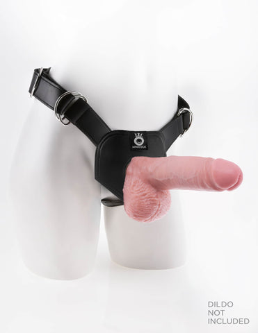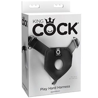 King Cock Play Hard Harness: When you're looking for a heavy-duty harness that performs as well as it looks, the King Cock Play Hard Harness is the perfect choice for professional results. With adjustable vinyl waist straps and sturdy metal hardware, this versatile harness works best with most of our King Cock suction-cup dildos. Just squeeze the suction-cup base of the dildo into the centre hole of the harness, adjust the waist straps until the harness is snug against your body, and enjoy the fun! The durable vinyl straps feature sturdy metal D-rings that easily adjust to fit waists up to 55" (140 cm), while the adjustable thong-style back offers sleek and sexy style. The comfortable harness keeps everything in place when the action heats up, while the soft vinyl material feels great against your skin.